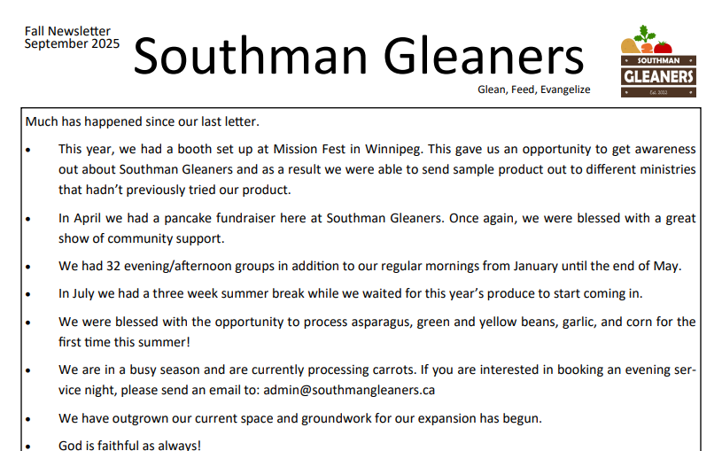 Newsletter SIGN UP Subscribe To Our Email Newsletter! Subscribe to receive exclusive news and information regarding the Southman Gleaners! Email Address Sign Up Thank you! DOWNLOAD Download Our Newsletters! September 2025 Download Now February 2025 Download Now November 2024 Download Now July 2024 Download Now